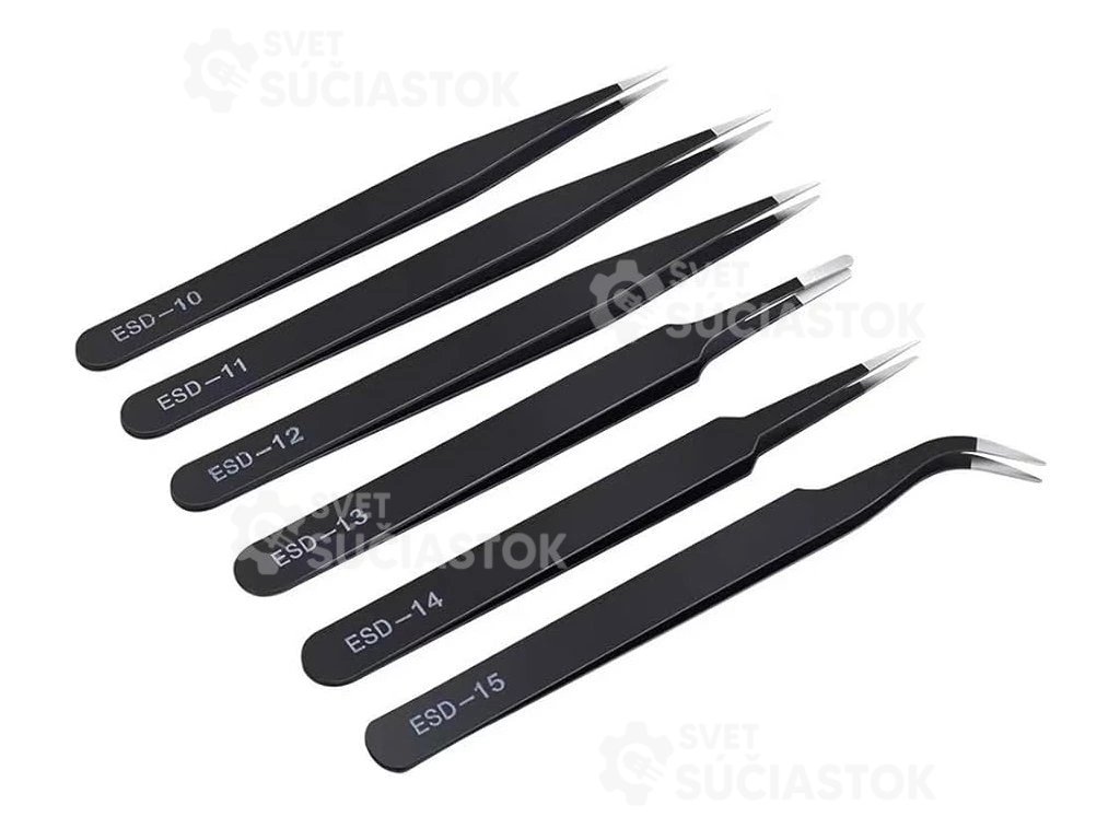 Univerzálna sada šiestich presných pinziet určených na prácu s citlivými elektronickými súčiastkami a drobnými mechanickými dielmi. Sada pokrýva rôzne tvary hrotov, aby bola vhodná pre široké spektrum servisných, montážnych aj hobby aplikácií.