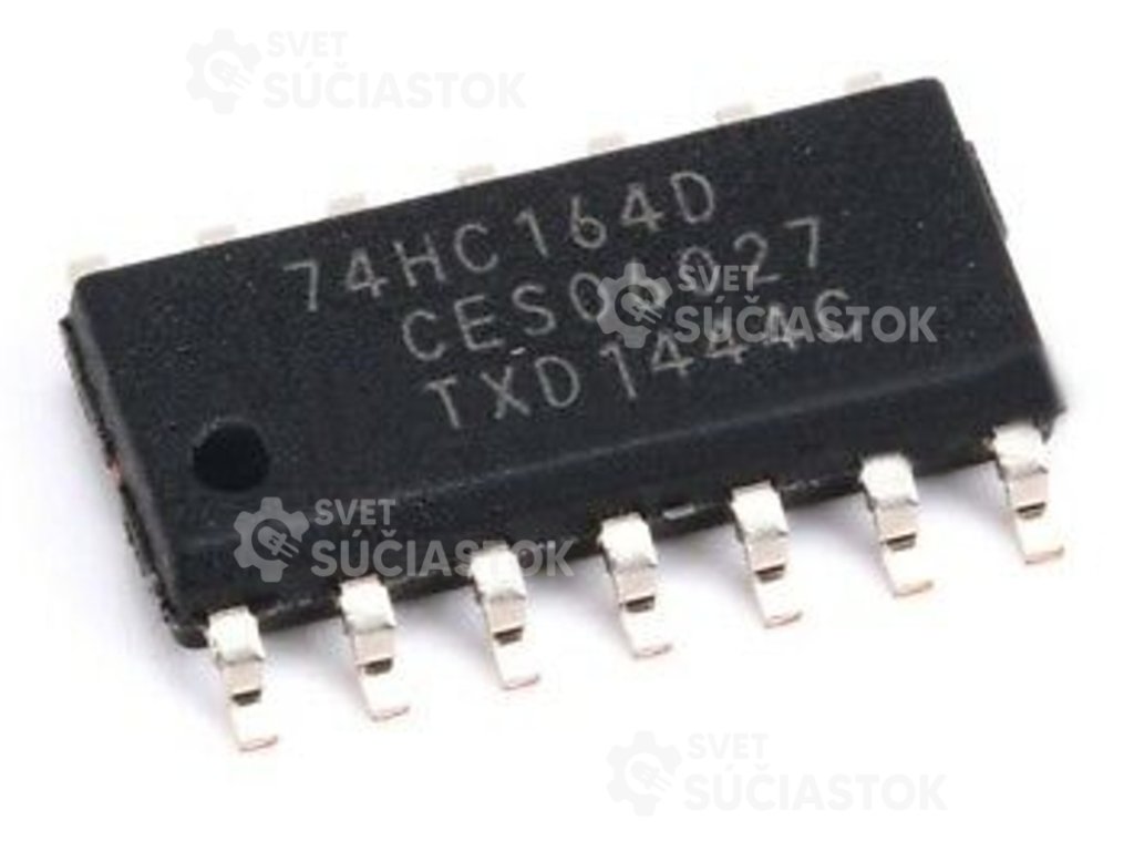 74HC164D je 8-bitový sériový posuvný register vyrobený v technológii High-Speed CMOS (HC). Tento integrovaný obvod prijíma sériové vstupy dát a posúva ich cez 8-bitový register, poskytujúc sériový alebo paralelný výstup. Neobsahuje výstupný latch, takže výstupy sú priamo spojené s registrovými bitmi.