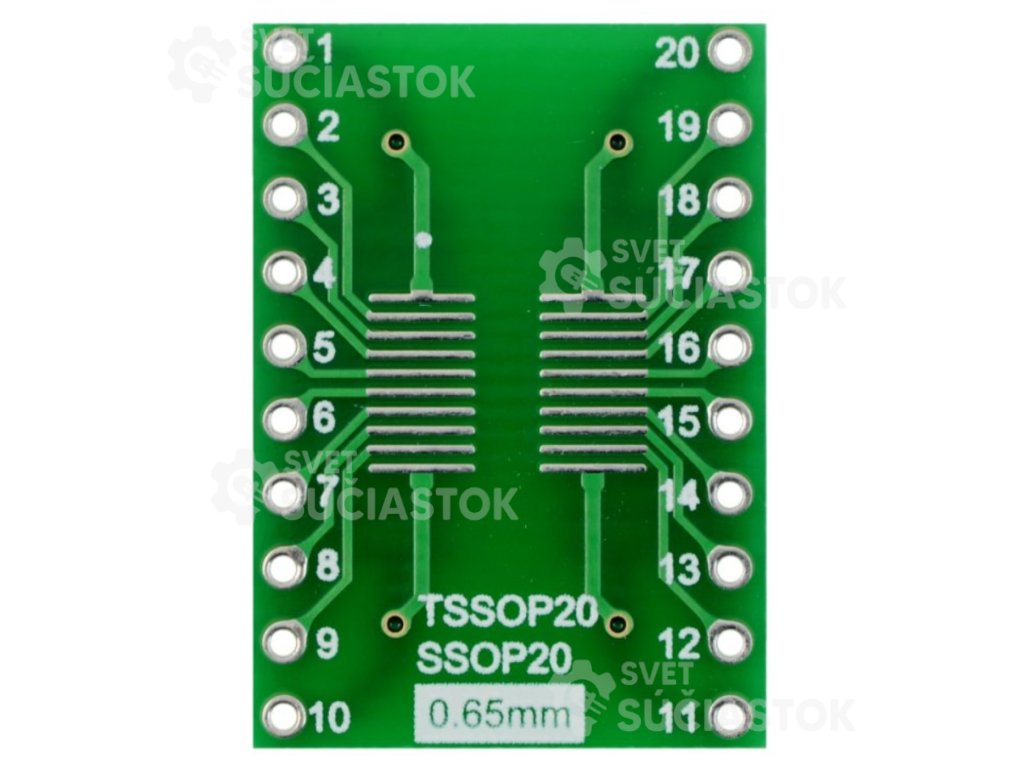 Obojstranná doska na pripojenie SOP20 čipov na breadboard cez DIP formát. Umožňuje jednoduchšie spájkovanie a vývoj.
