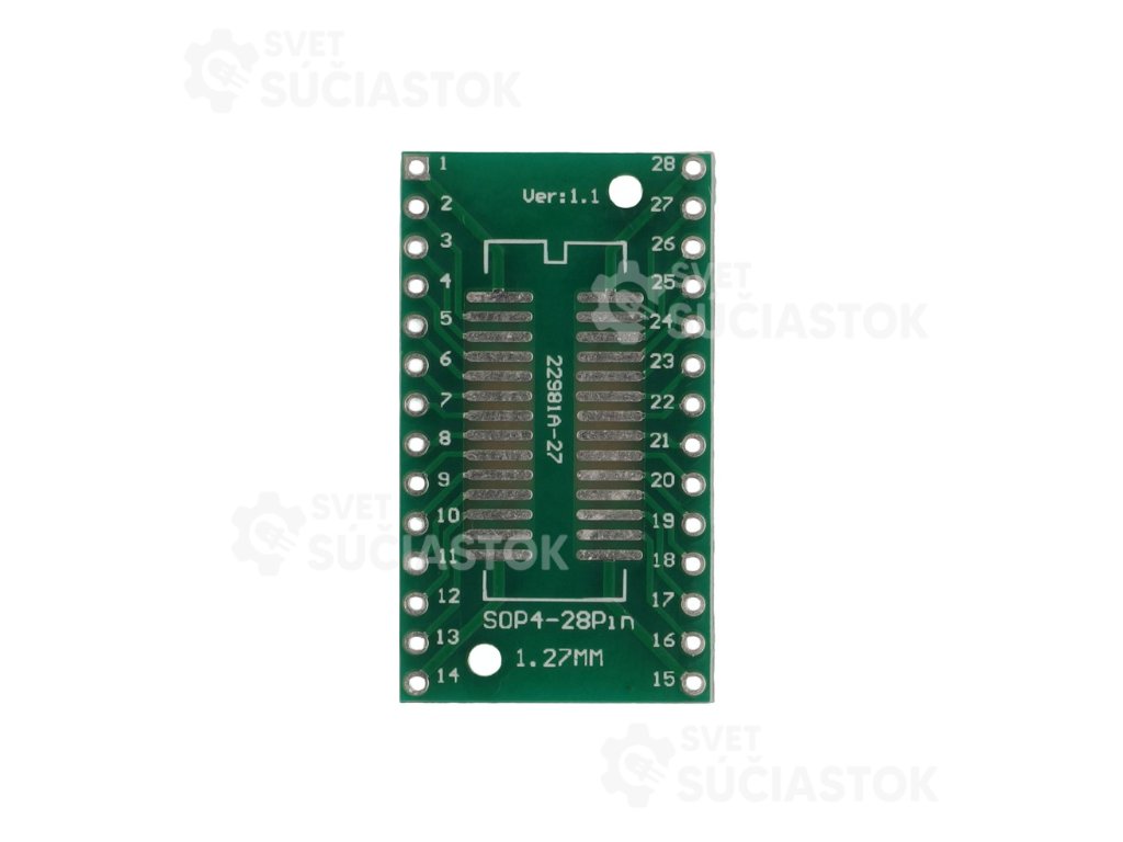 Obojstranná adaptérová doska pre SMD čipy v puzdre SOP28, navrhnutá na prevod vývodov do štandardného 2,54 mm DIP rozhrania. Umožňuje jednoduché testovanie a prototypovanie s rozsiahlejšími obvodmi.