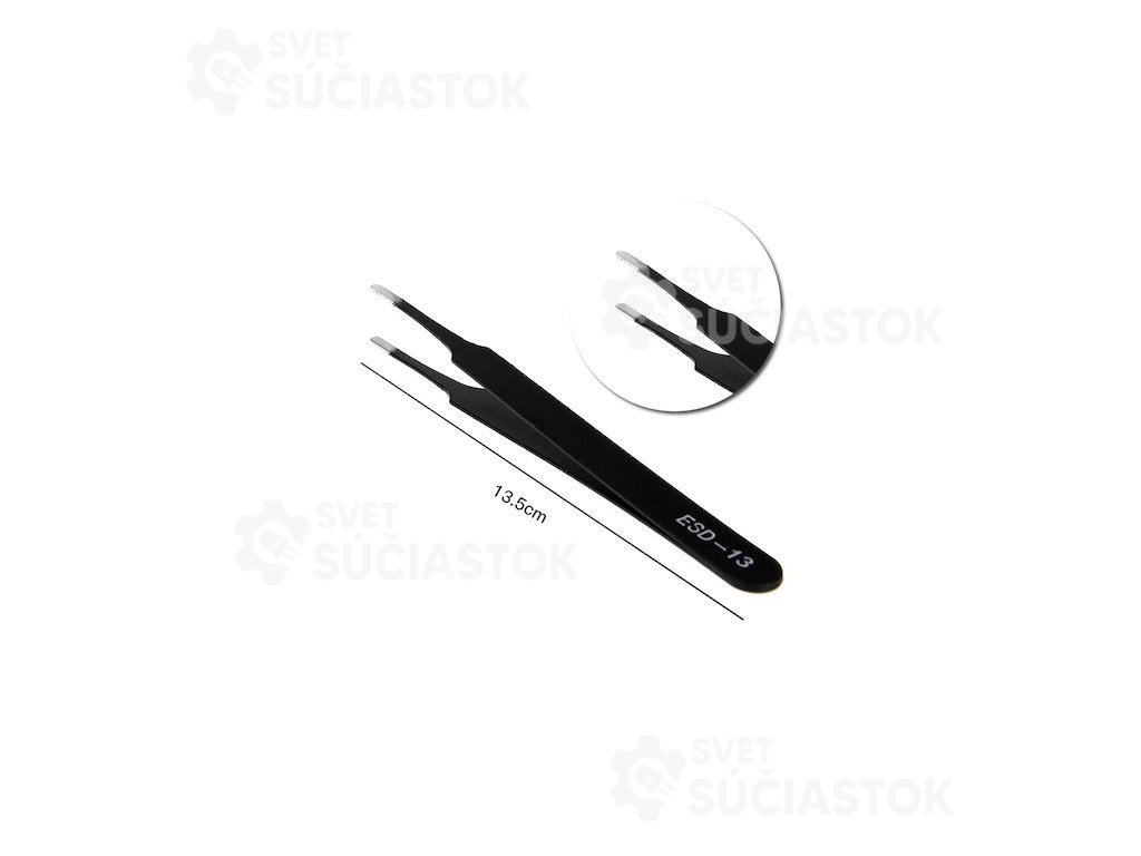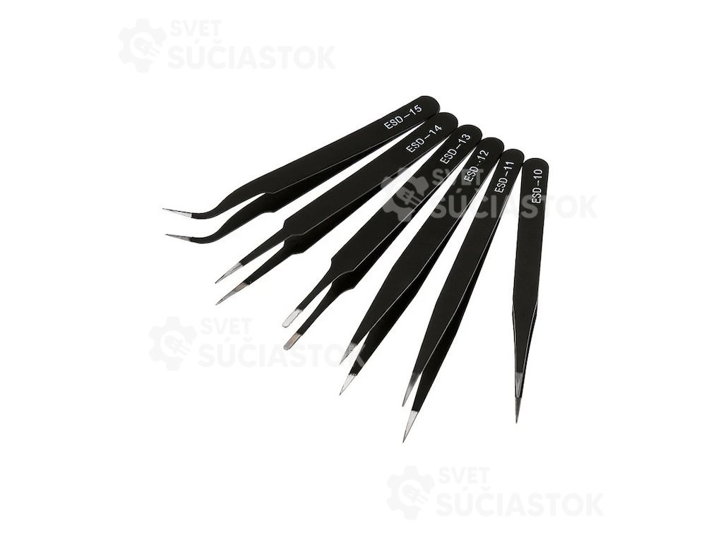 Antistatické nemagnetické pinzety. Balenie obsahuje 6 rôznych typov podľa typu hrotu alebo tvrdosti.