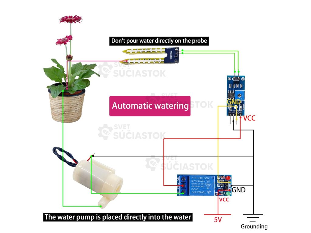 DIY automatický zavlažovač kvetov a pôdy so senzorom vlhkosti pôdy + DC konektor
