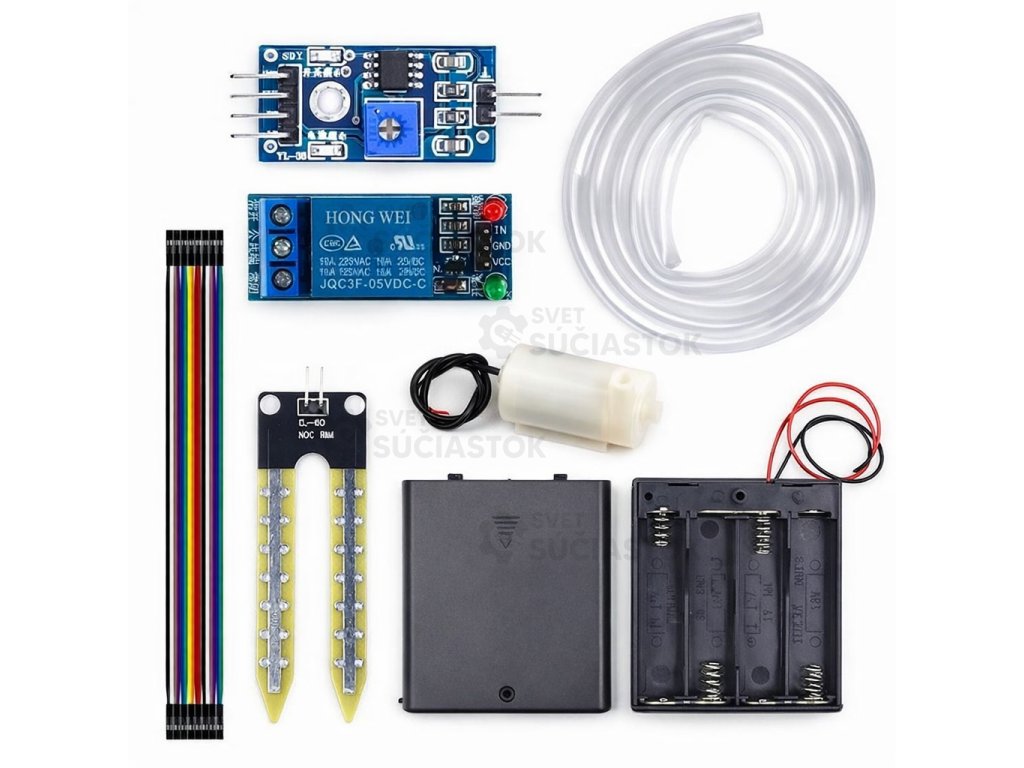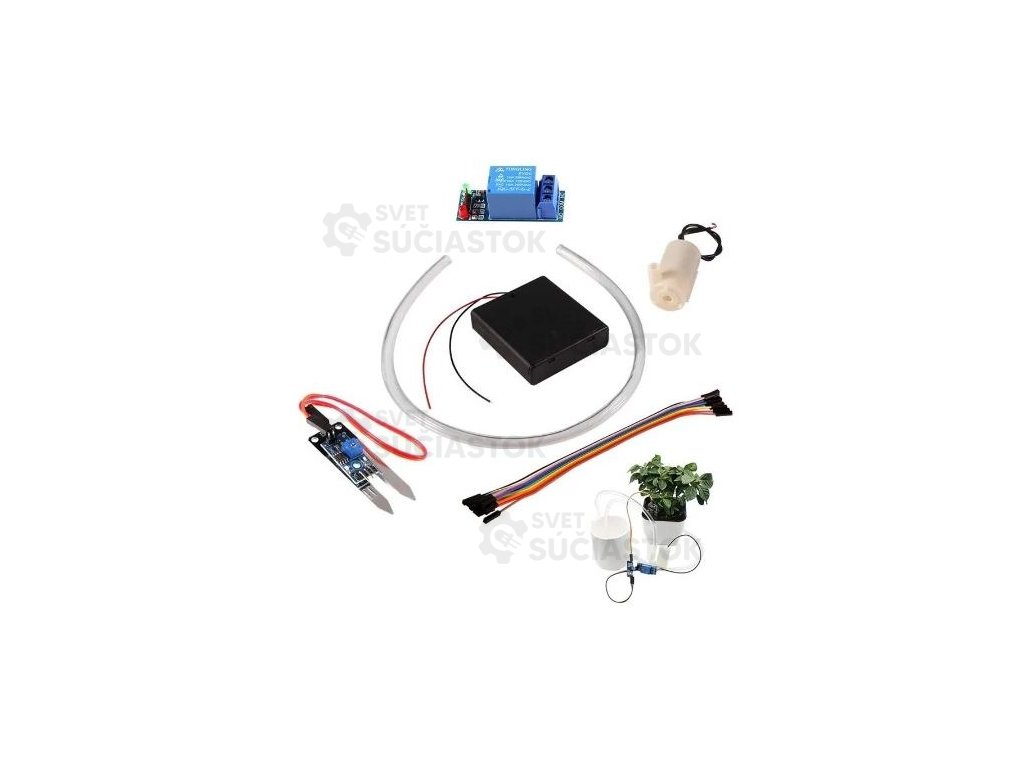 Stavebnica automatického zavlažovania, ktorá na základe merania vlhkosti pôdy zapína čerpadlo a zavlažuje rastliny podľa potreby.