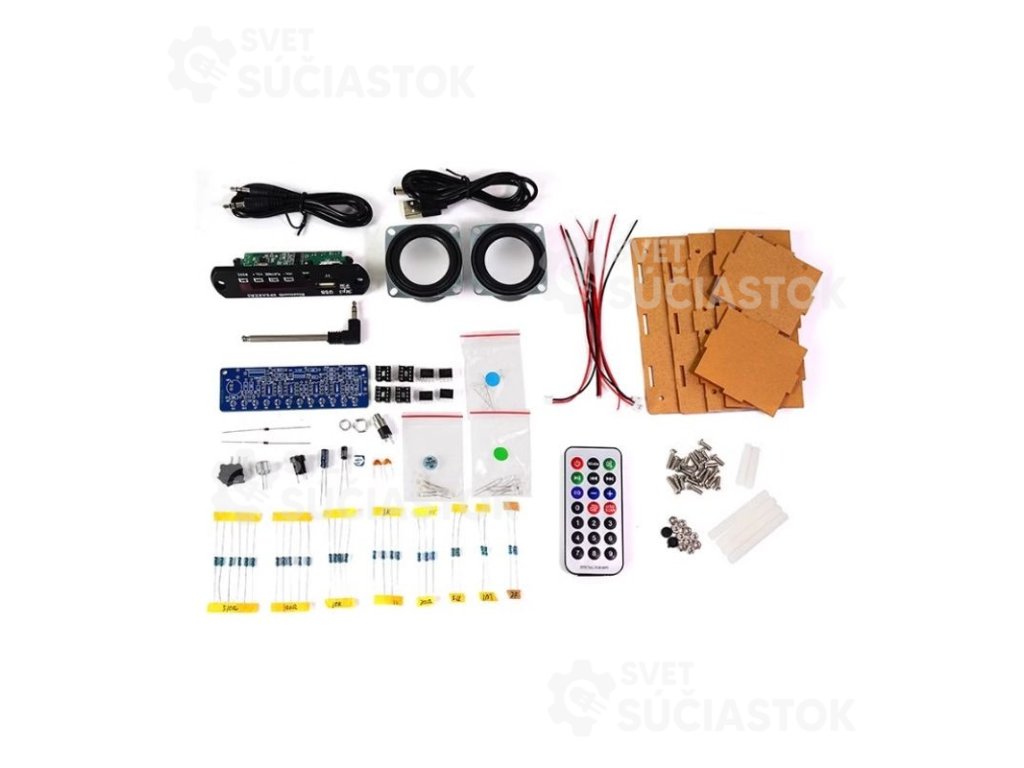 - Obsah kitu: PCB doska, reproduktor, držiaky, tlačidlá, kondenzátory, rezistory, integrované obvody a manuál