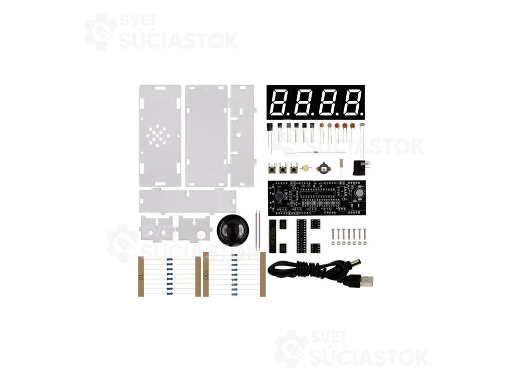 - Obsah kitu: PCB doska, LED segmenty, rezistory, kondenzátory, integrované obvody, držiaky, káble a manuál