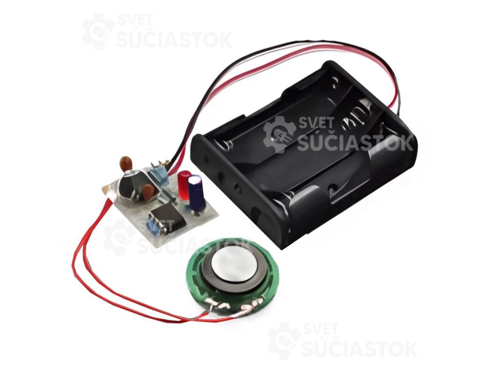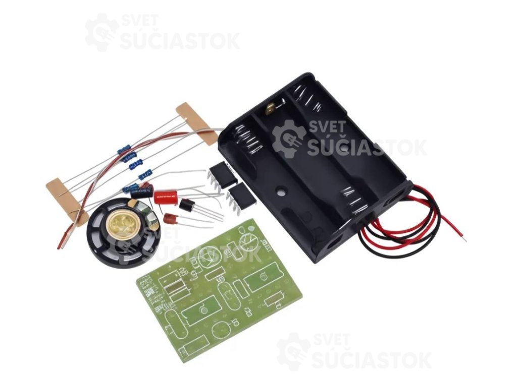 - Obsah kitu: PCB doska, NE555, rezistory, kondenzátory, potenciometre, reproduktor, konektory a ďalšie súčiastky