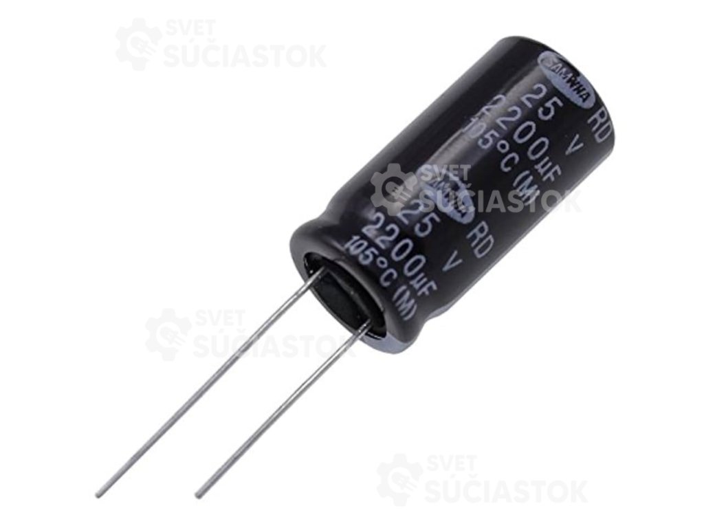 Elektrolytický kondenzátor 2200uF/25V Rozmery 13x25mm Prevádzková teplota od -25 °C do +85 °C, P5Výrobca:JAMICON