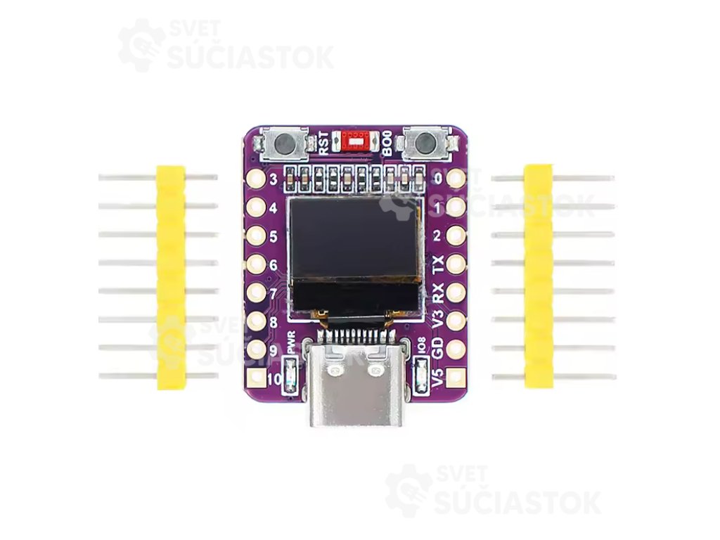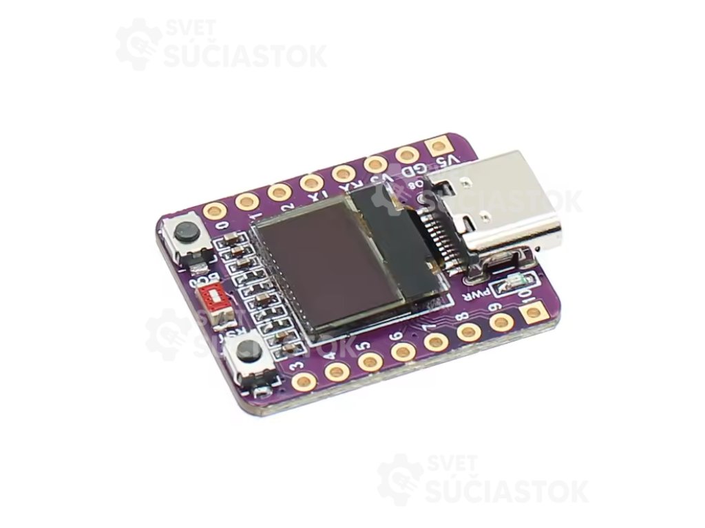 Vývojová doska s čipom ESP32-C3FN4/FH4 a integrovaným 0,42" OLED displejom predstavuje kompaktné riešenie pre vývoj nízkoenergetických IoT aplikácií. Podporuje WiFi a Bluetooth (LE).Súčasťou dosky je integrovaný OLED displej (rozlíšenie 40×2), ktorý je vhodný na zobrazovanie základných údajov bez potreby externého výstupu. Vďaka USB-C konektoru je programovanie a napájanie jednoduché a rýchle. Doska podporuje SPI, I²C, UART a má viacero GPIO pinov, vrátane analógových vstupov.