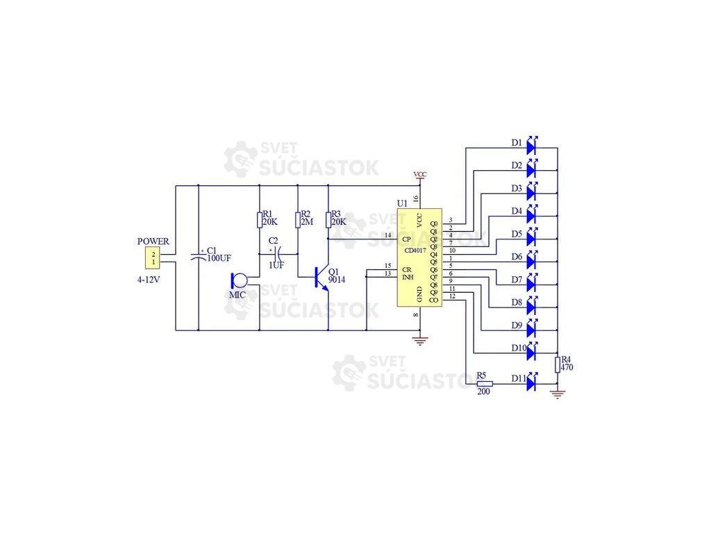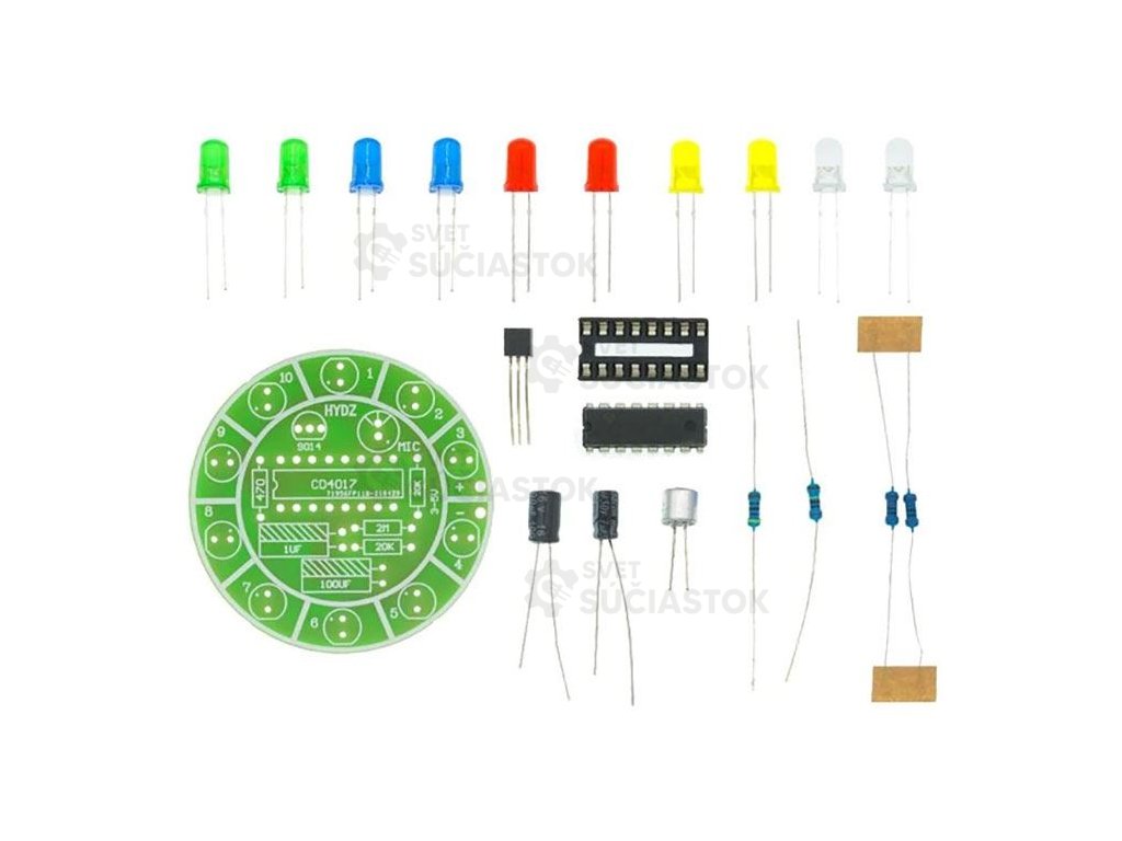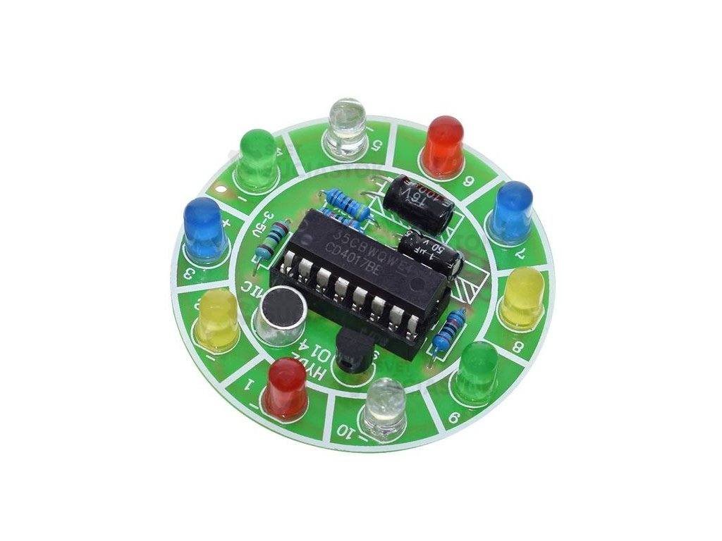 Jednoduchá elektronická stavebnica s LED diódami, ktorá reaguje na zvuk z mikrofónu a postupne rozsvecuje jednotlivé LED, čím vytvára efekt bežiaceho svetla. Vhodná na učenie spájkovania aj základov elektroniky.