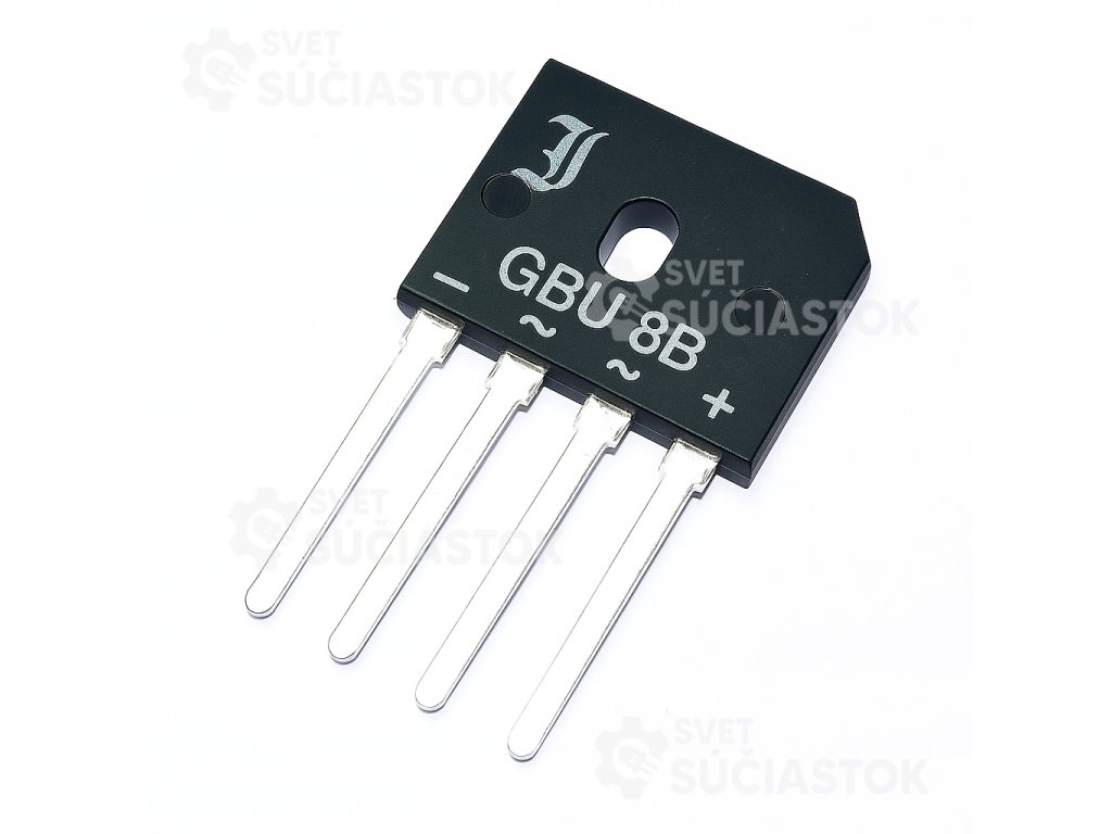GBU8B je jednofázový mostíkový usmerňovač v plochom púzdre typu GBU-SIL, určený na spoľahlivú konverziu striedavého napätia na jednosmerné. S vysokou prúdovou zaťažiteľnosťou a kompaktným prevedením je vhodný pre napájacie zdroje, výkonovú elektroniku a rôzne priemyselné aplikácie.