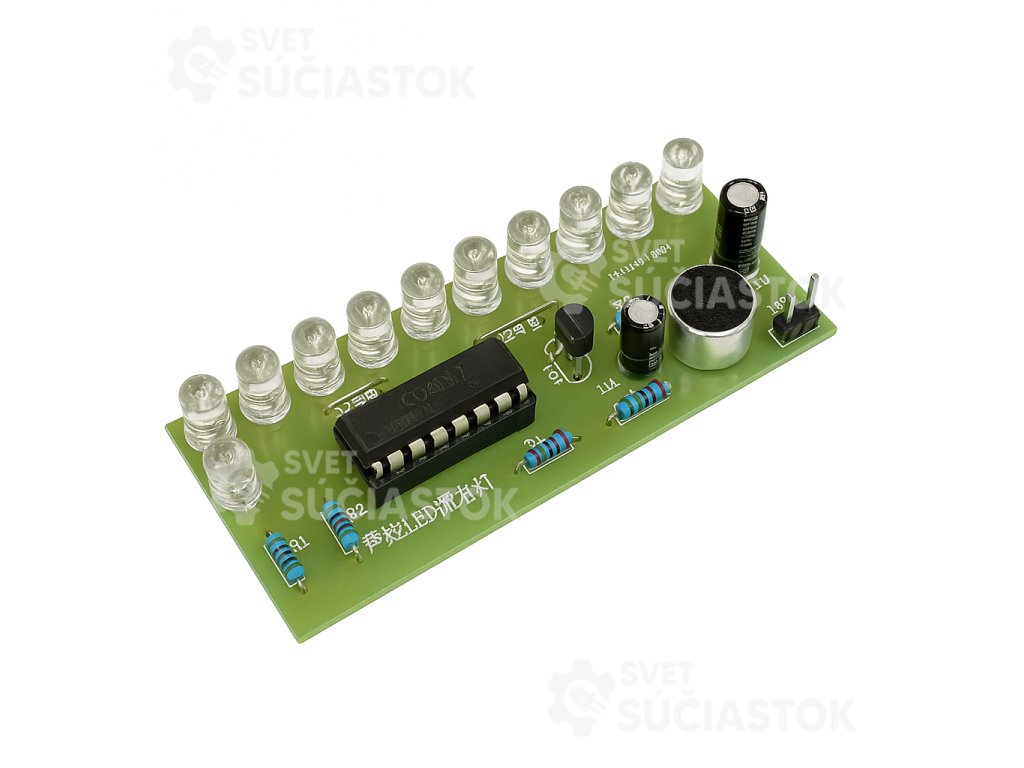 DIY elektronická stavebnica určená na výučbu elektroniky a tréning spájkovania. Obvod využíva integrovaný čip CD4017, ktorý pomocou zvuku z mikrofónu postupne spína 10 LED diód, čím vytvára efekt „tečúcej vody“. Modul zároveň slúži ako praktická ukážka činnosti čítača, deliča frekvencie a riadenia farebných svetelných efektov.