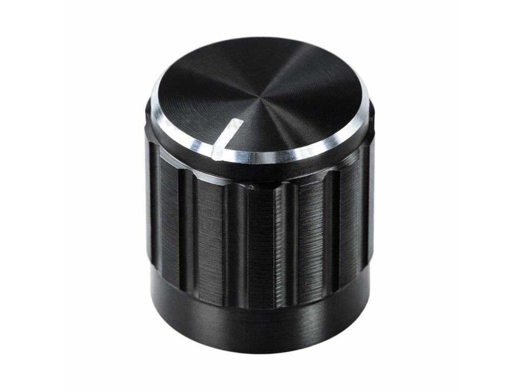 Otočný gombík určený na osku s priemerom 6 mm, vhodný na potenciometre, enkodéry a ovládacie prvky v elektronike. Má protišmykové rebrovanie po bokoch pre pohodlné otáčanie a bielu orientačnú čiaru pre jednoduché nastavenie polohy.