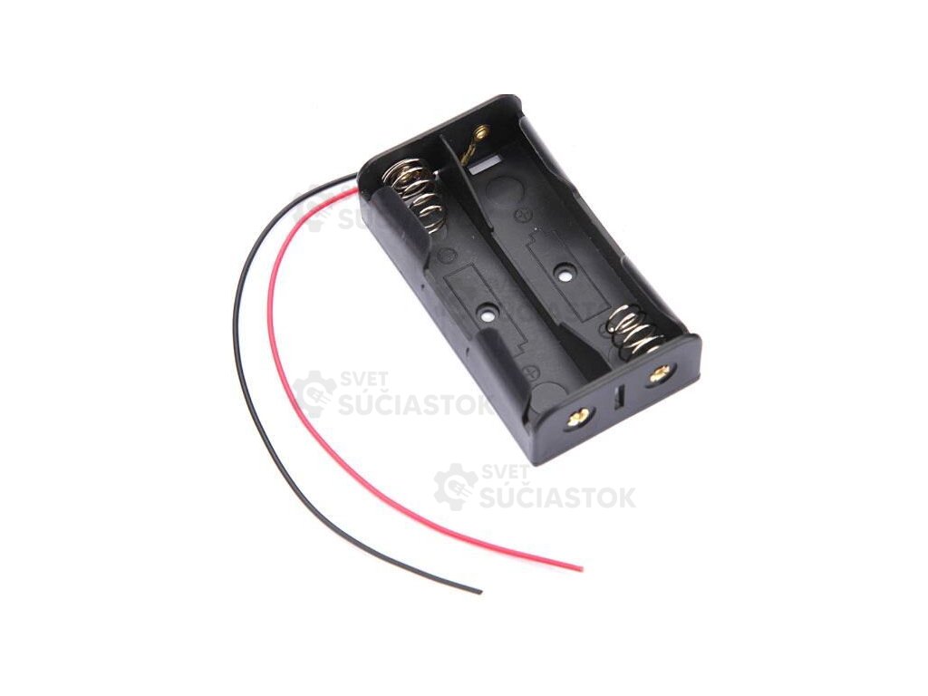 Plastové puzdro na 2 batérie typu AA, uložené vedľa seba. Vhodné pre DIY projekty, napájanie elektroniky alebo powerbanky. Obsahuje vývody na jednoduché pripojenie.