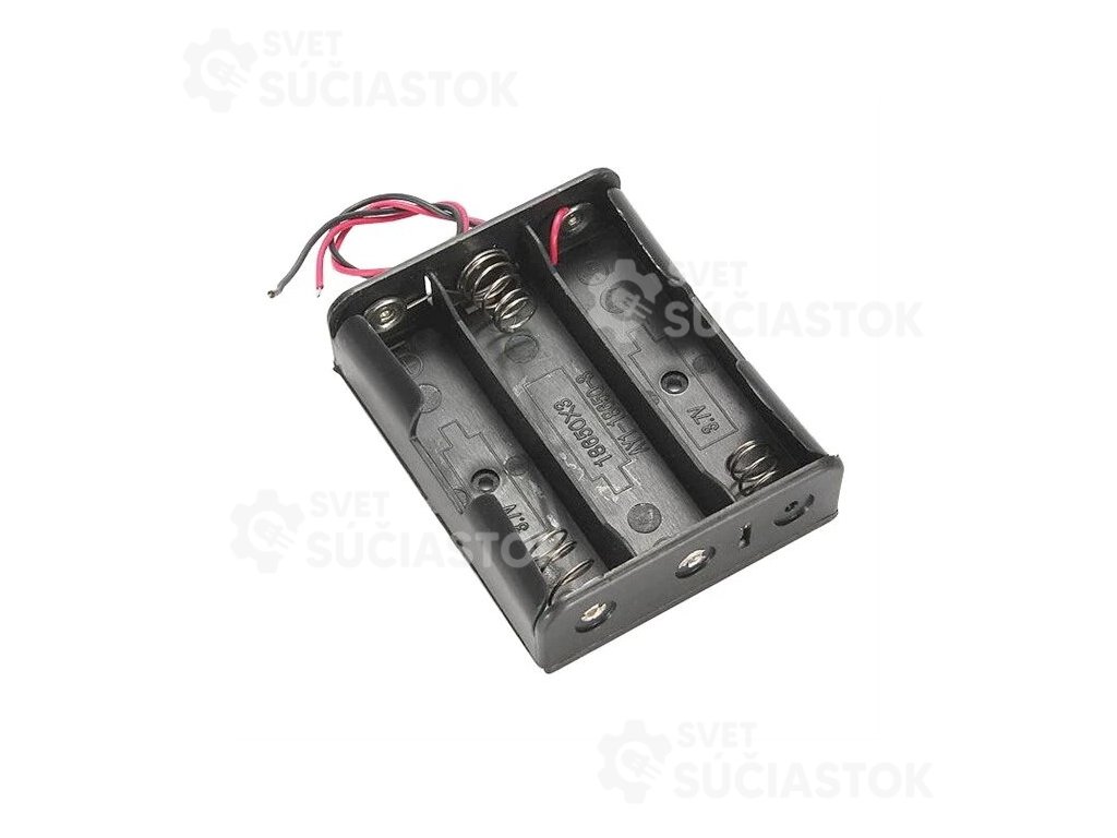 Plastové puzdro na 3 batérie typu 18650, uložené vedľa seba. Vhodné pre DIY projekty, napájanie elektroniky alebo powerbanky. Obsahuje vývody na jednoduché pripojenie.