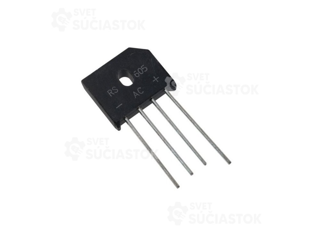 Jednofázový mostíkový usmerňovač v puzdre typu RS-6, ideálny pre univerzálne napájacie aplikácie s nižším výkonom.