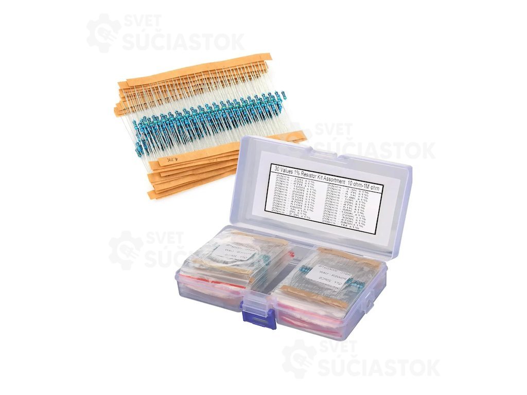 Balenie rezistorov 1/4W 1% 600ks v krabičke. V sade sa nachádza 30 rôznych hodnôt po 20 kusov, odpory sú typu metal film, 1/4W.