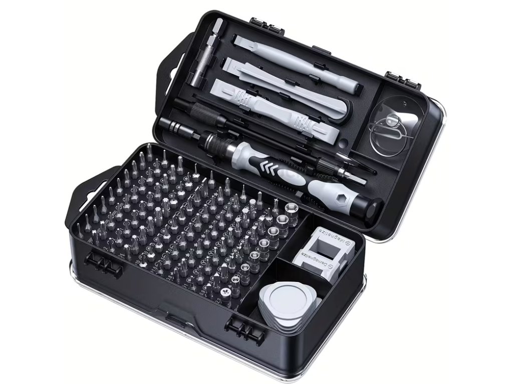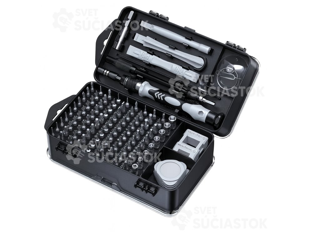 Sada určená na servis elektroniky, počítačov, mobilných zariadení a jemnej mechaniky. Obsahuje 115 výmenných bitov z chróm-vanádiovej ocele, vrátane Torx, HEX a ďalších špeciálnych profilov. Magnetická hlavica skrutkovača uľahčuje manipuláciu so skrutkami, protišmyková rukoväť zabezpečuje pohodlné uchopenie.