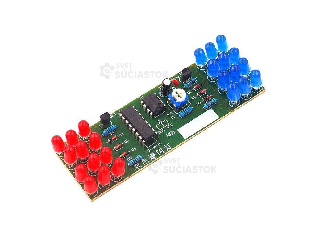 Jednoduchá elektronická stavebnica blikajúceho policajného majáka s 12 červenými a 12 modrými LED diódami. Modul po zostavení vytvára striedavý svetelný efekt – najprv bliká jedna strana, následne druhá strana. Rýchlosť blikania je možné nastaviť trimrom podľa potreby.