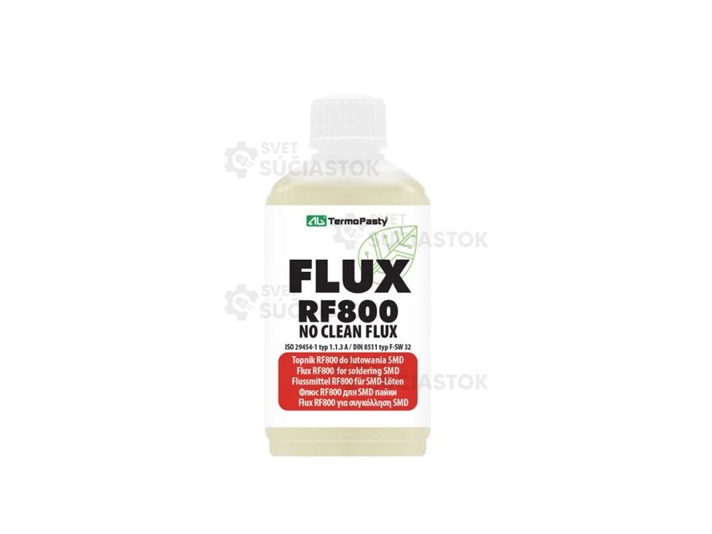 Tavidlo FLUX RF800 je profesionálne no-clean tavidlo určené pre presné a spoľahlivé spájkovanie elektronických súčiastok, najmä v SMD technológii. Vďaka kalafunovému zloženiu so strednou aktivitou (ROL0) zabezpečuje výbornú zmáčavosť medených (Cu) a cínovo-olovnatých (PbSn) povrchov, čo vedie k pevným, lesklým a dlhodobo spoľahlivým spojom.