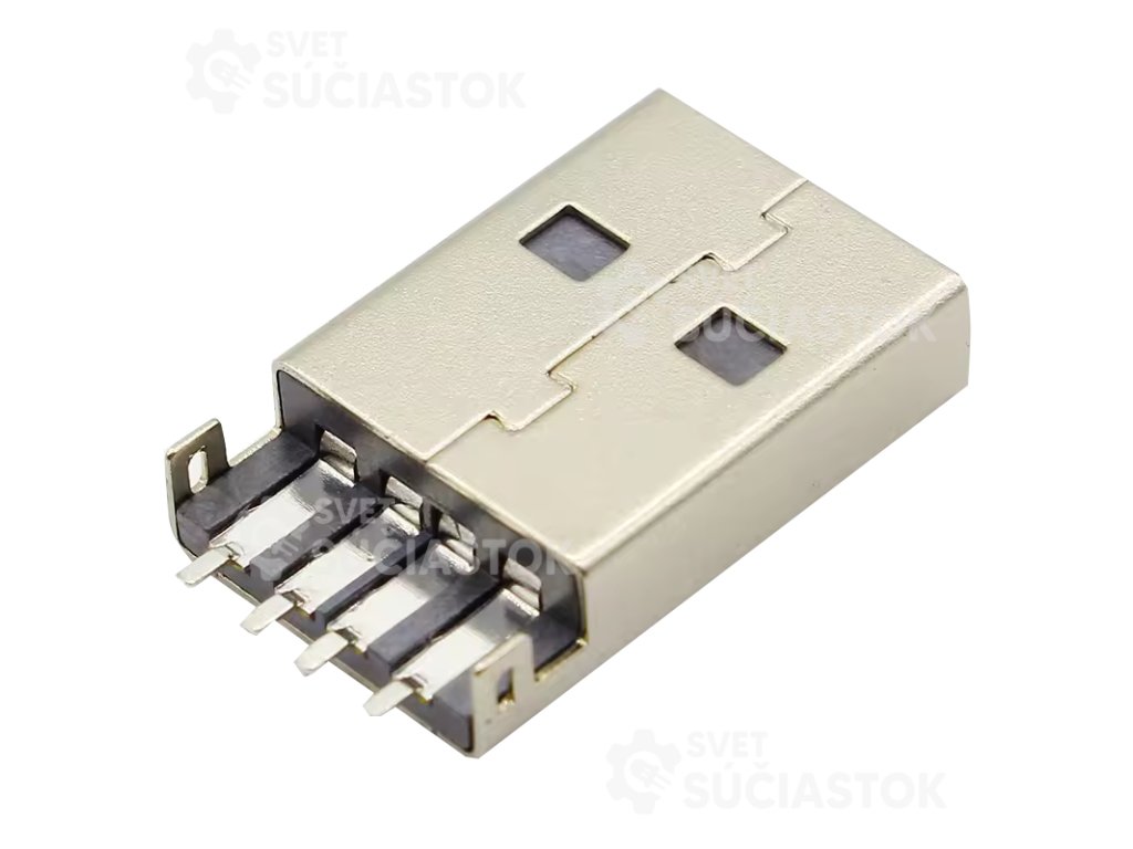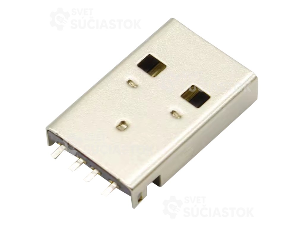 Štandardný USB 2.0 konektor typu A (samec) určený pre povrchovú montáž (SMT). Vhodný pre prenos dát aj napájanie/nabíjanie zariadení.